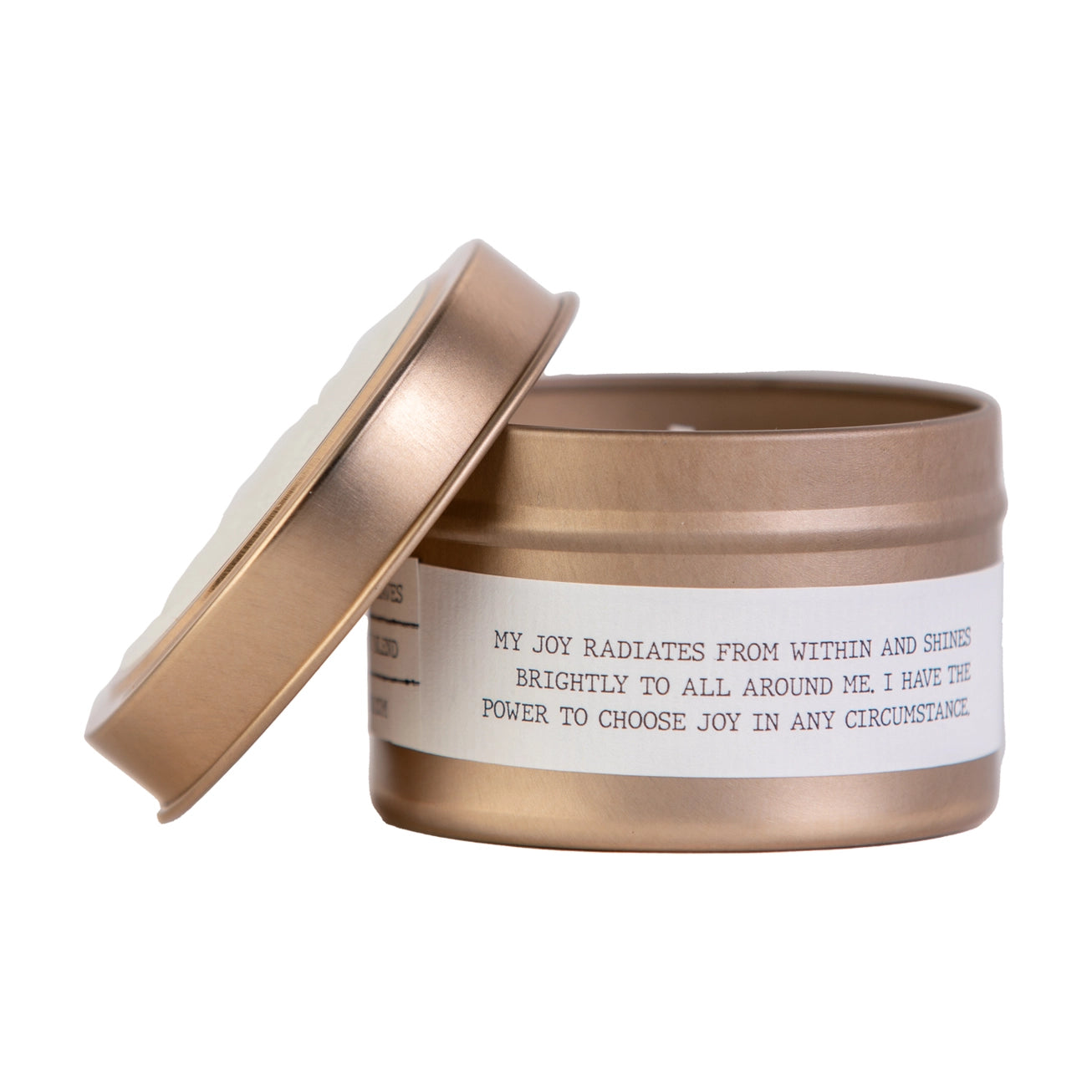 I Am Joyful Travel Tin. Create an atmosphere of joy with notes of mandarin, bergamot, jasmine & white tea leaves. This 4 oz travel tin, made with soy blend wax and clean-burning cotton wicks, was lovingly handcrafted by survivors of human trafficking at Freedom Studios. Every candle carries a story of hope, healing, and new beginnings, a small light that helps restore lives.