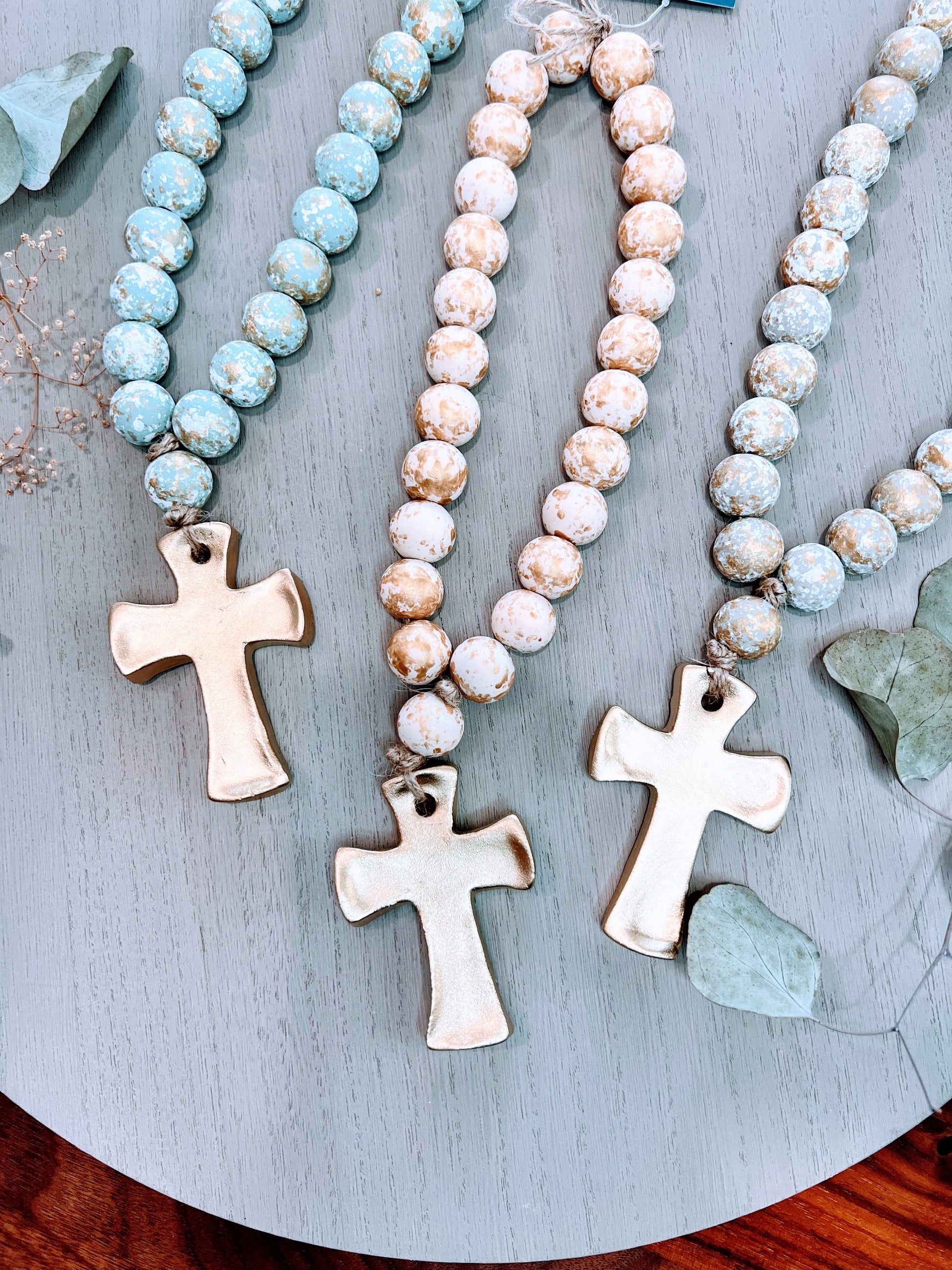 Blessing Beads With Cross. Handmade from a women owned small business. They are crafted from 25 3/4in wooden beads hand painted and strung with jute twine. Each cross is one of a kind and handmade from clay and enameled in gold. Each design blends a 'little bit of fancy' with comfortable, casual colors and patterns to create items that are equally appropriate for use everyday or on the fanciest of occasions.