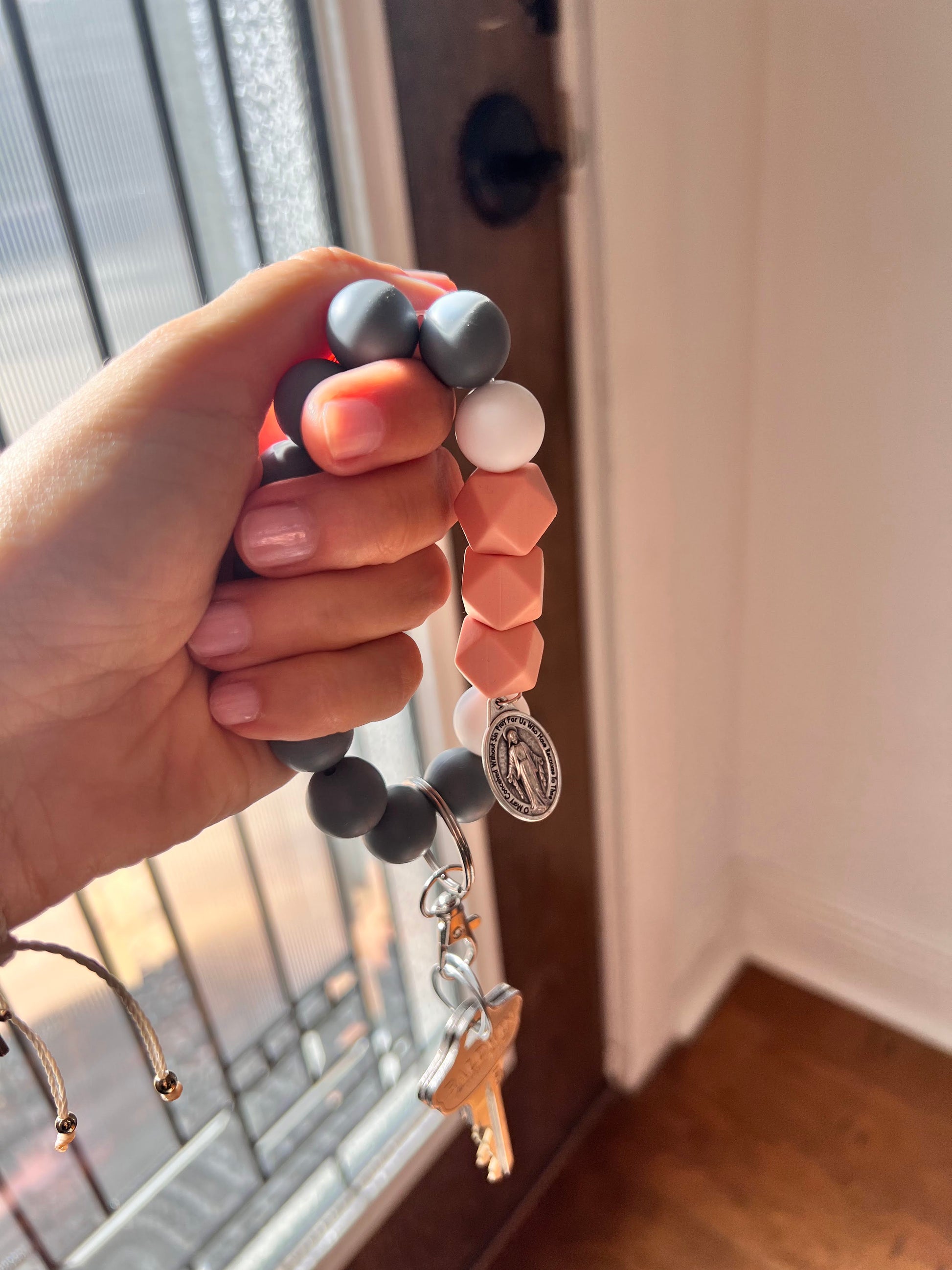 Decade Rosary Wristlet Keychain. Pray the Rosary to Our Lady of the Miraculous Medal while on the go with this single-decade Rosary keychain, and receive all her blessings! This beautiful and practical piece serves as both a reminder to pray the Rosary and a stylish way to keep your keys secure. Lightweight and durable, this soft wristlet slides over your wrist, is easy to find in your bag, and can be hung up at home.