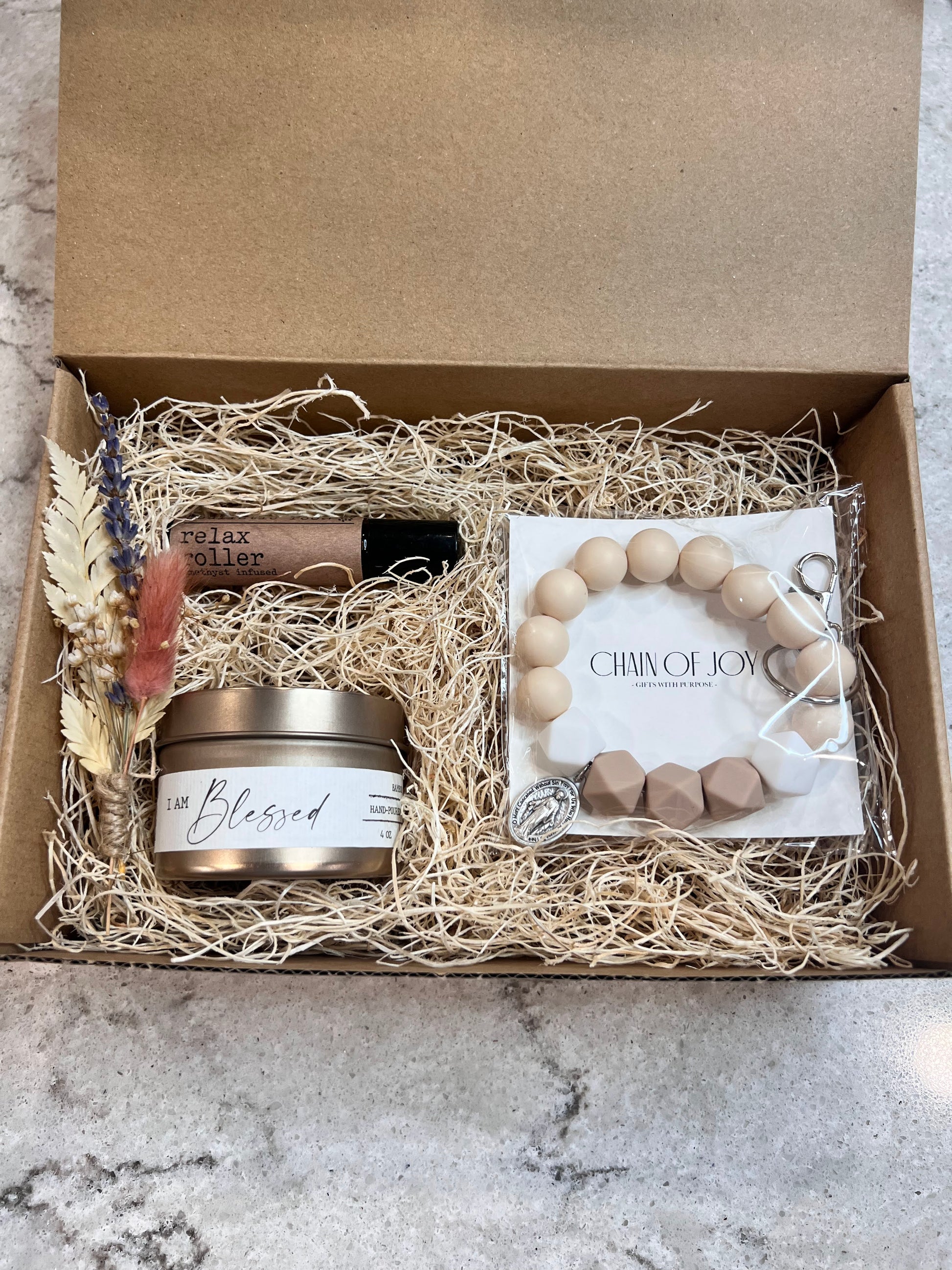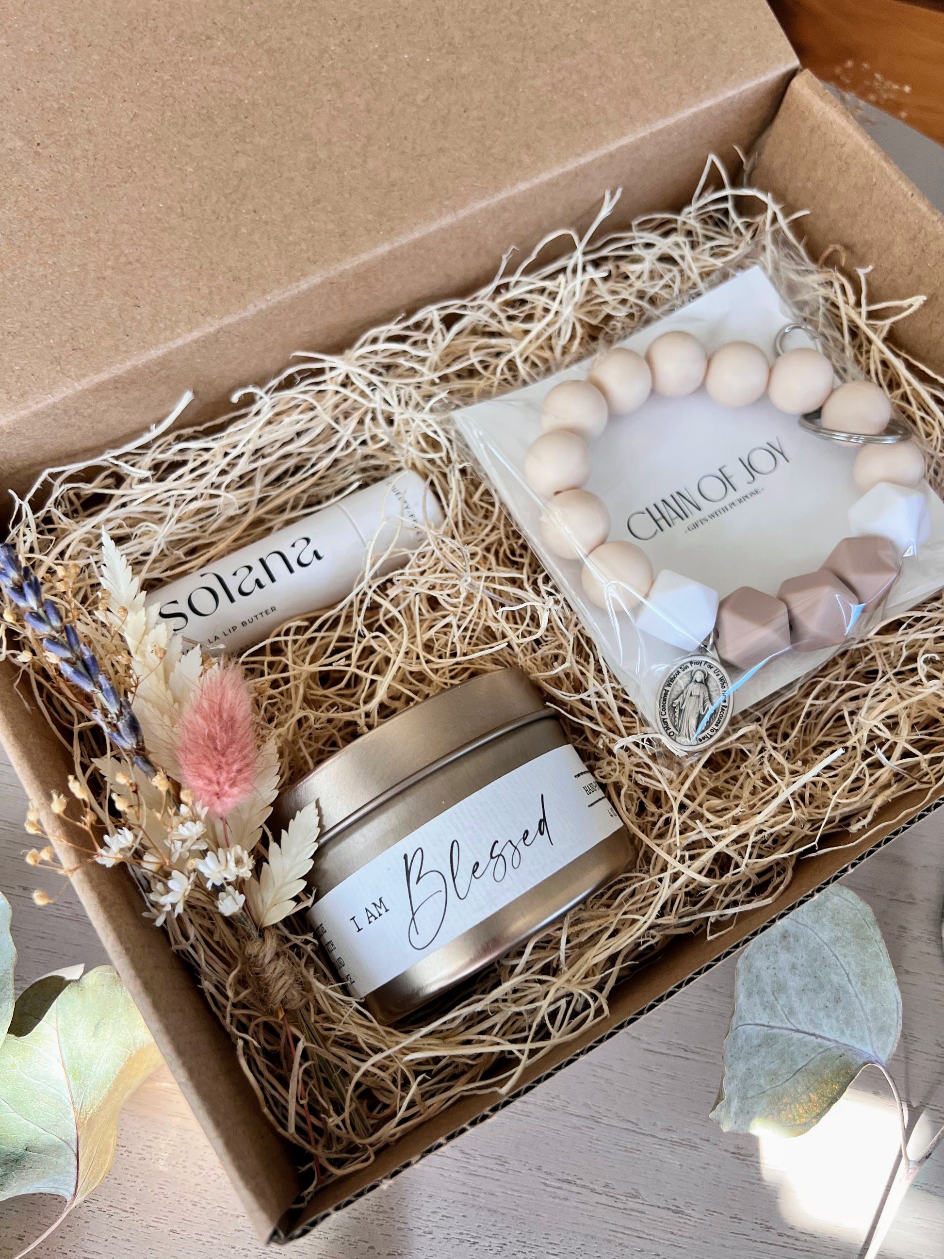 This faith-filled gift offers peace, gratitude, and quiet strength for the journey. With a decade rosary wristlet to keep prayer close, a soothing candle to reflect on blessings, and a calming roller to relax the mind, this box is a gentle reminder of God’s presence in every moment. Thoughtfully created to uplift the soul and bring comfort wherever you go.