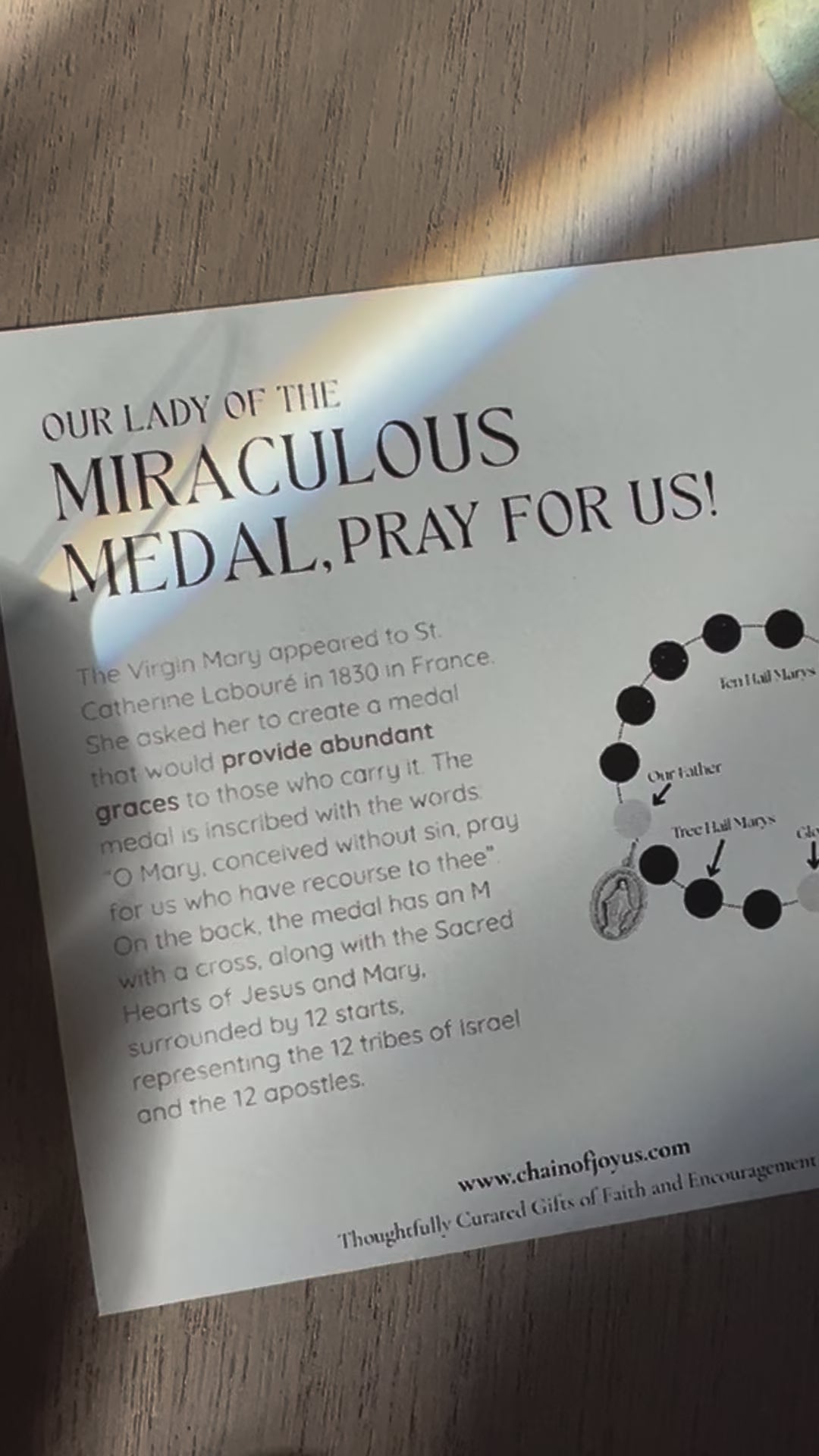 Wristlets are medium-sized, about 2.5” in diameter on the inside. Made with silicone beads and strong nylon thread, it includes the Miraculous Medal, a card with the story, and a guide on how to pray the Decade Rosary.