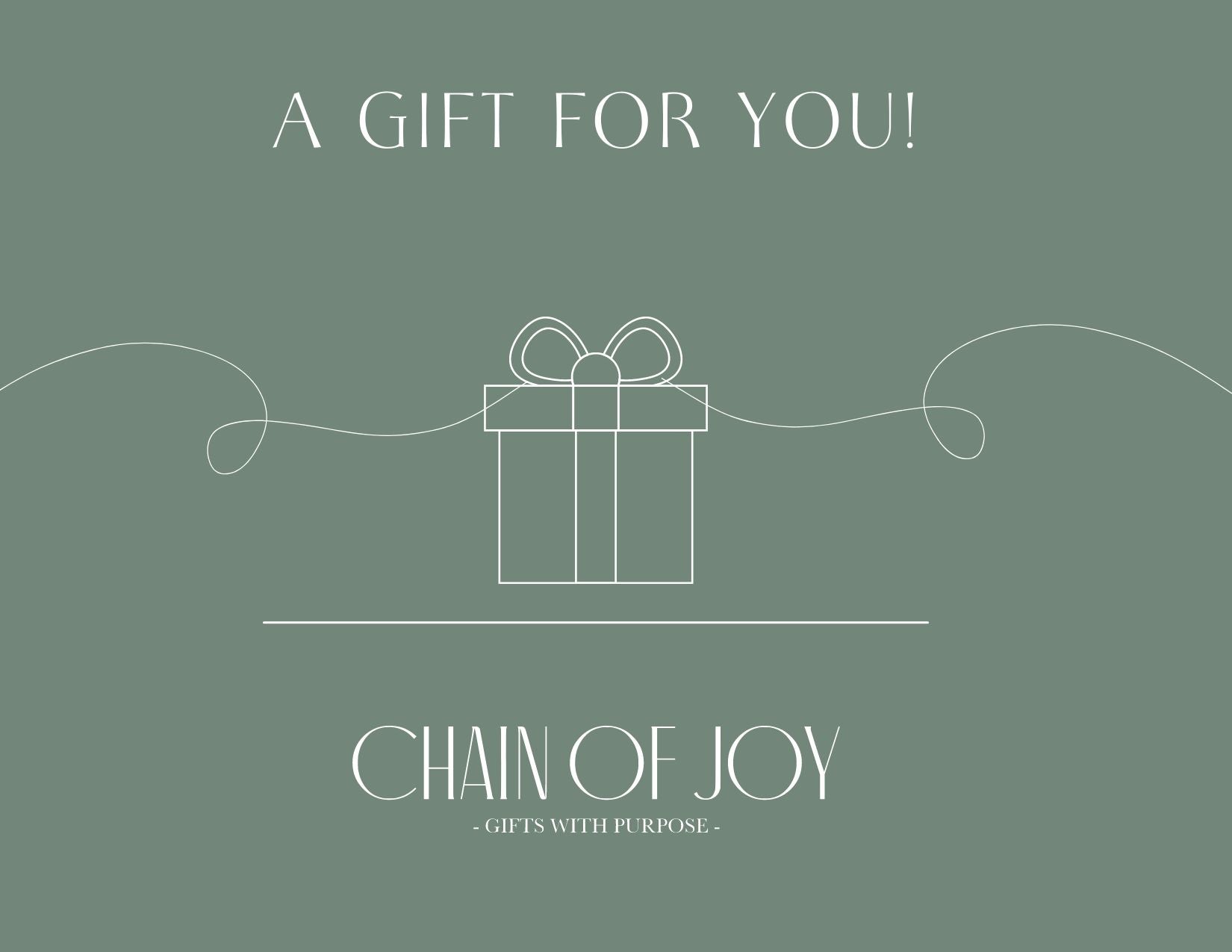 Not sure what to choose? Give the gift of choice with a Chain of Joy Gift Card! Perfect for any occasion, this gift card allows your loved ones to select faith-inspired gifts that bring peace, joy, and comfort. A thoughtful way to share God’s love and encouragement, while letting them choose what speaks to their heart.
