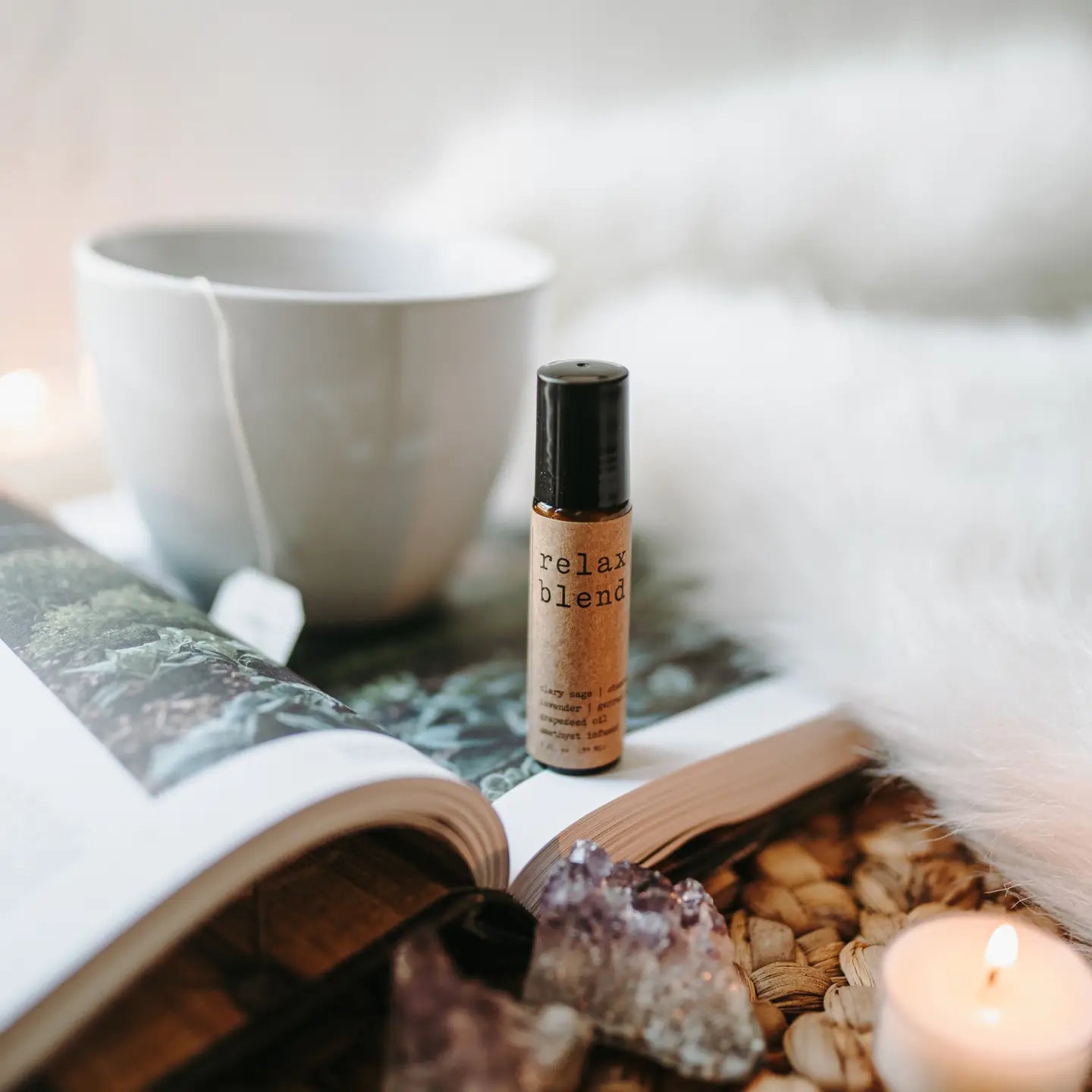 Relax Roller | Made with Essential Oils + Amethyst Crystals. Relax Calm your mind with this essential oil roller. This blend contains lavender, chamomile, and frankincense to help you unwind and reset. The formulation is infused with amethyst gemstones for additional properties.