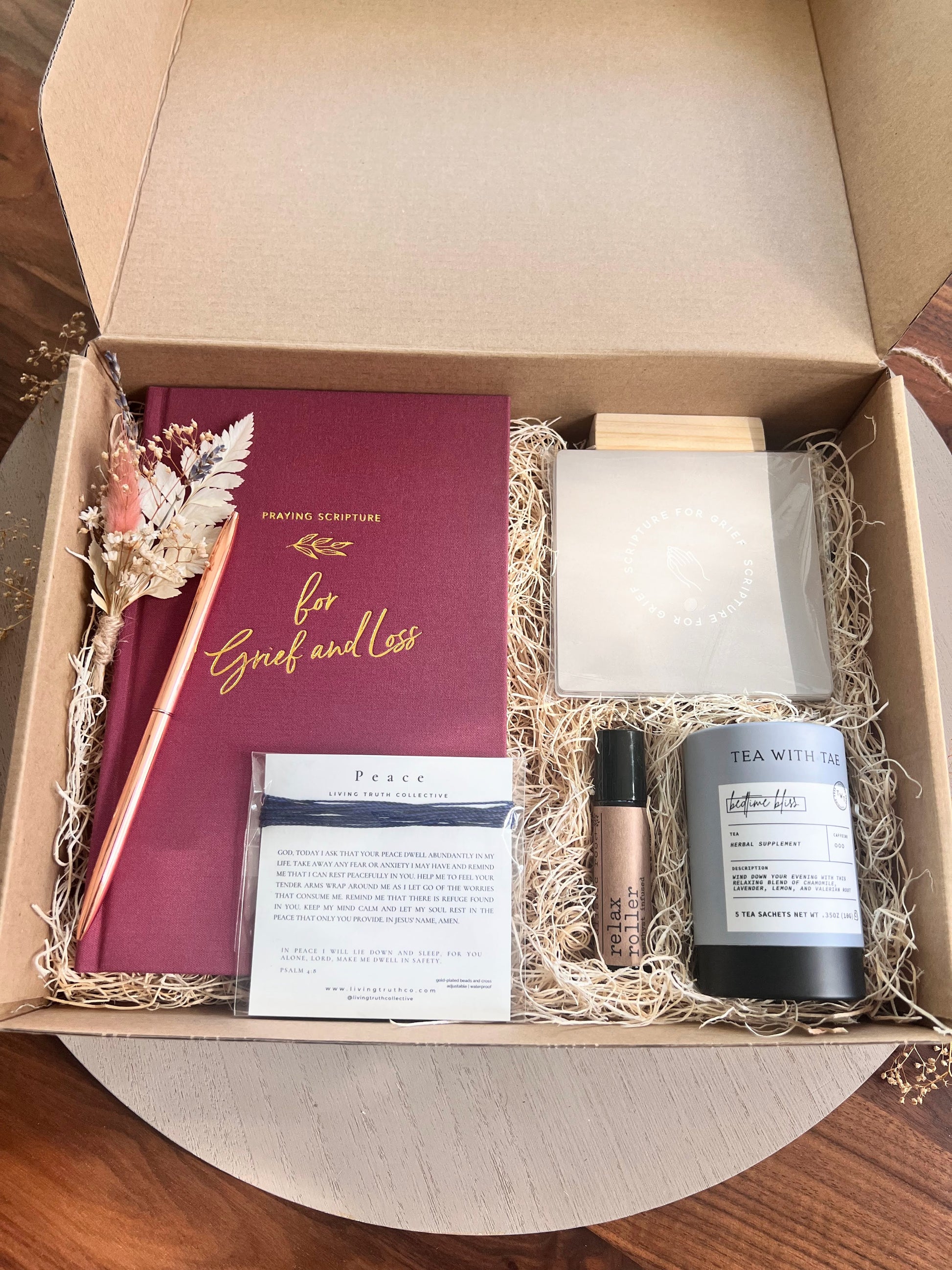 A specially curated gift box for those experiencing the loss of a loved one, designed to bring peace and comfort. Filled with thoughtful items and promises from God to remind you or your loved one of His love during this difficult time.