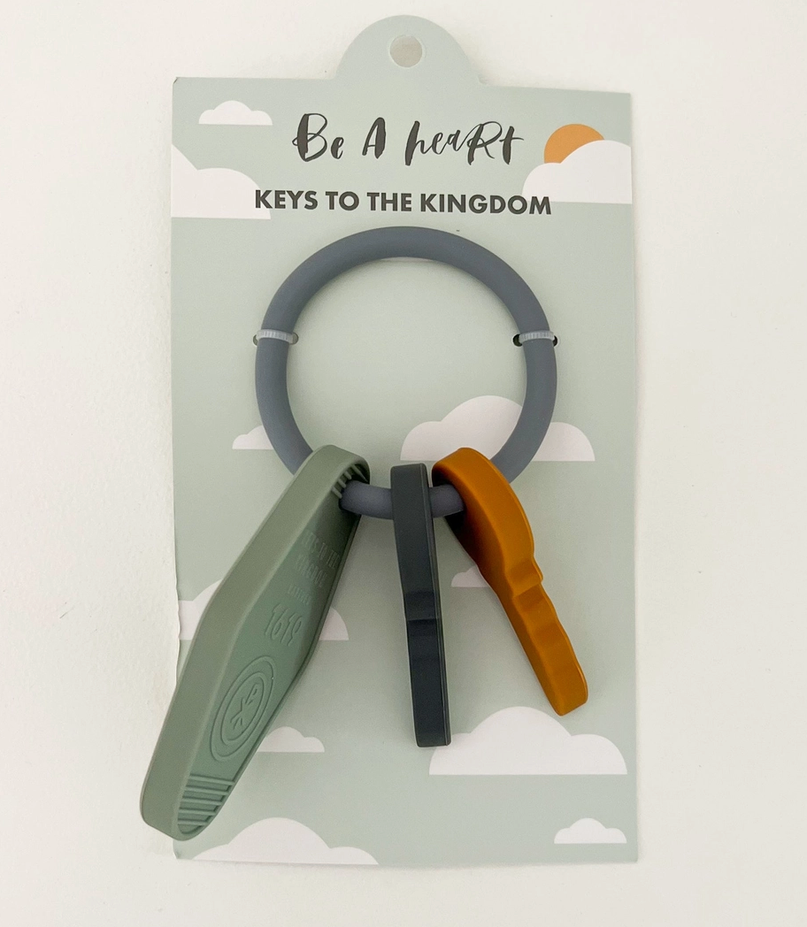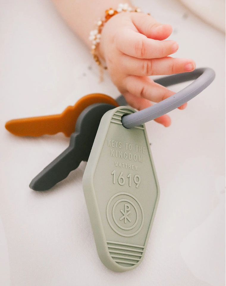 Keys To the Kingdom Silicone Teether.The silicone Keys to the Kingdom Baby Teether is more than just a teething ring; it's a symbol of hope and love. It's a reminder that we are the ones to pass on our faith with our children. There are two keys on a ring along with a vintage style hotel keychain. It says "Keys to the Kingdom // Matthew 1619 //