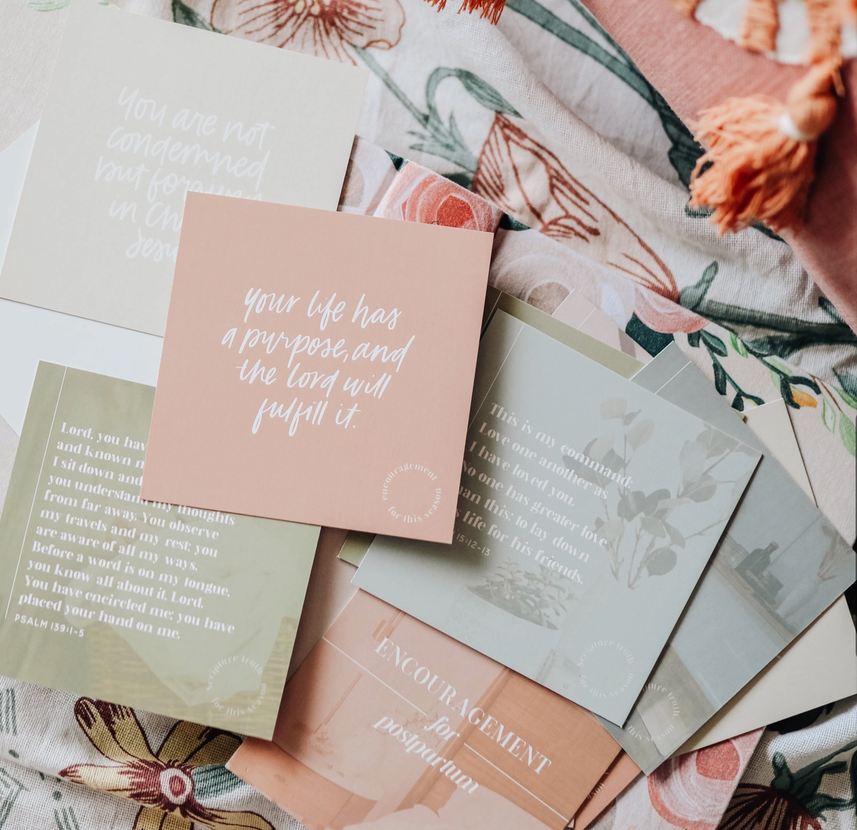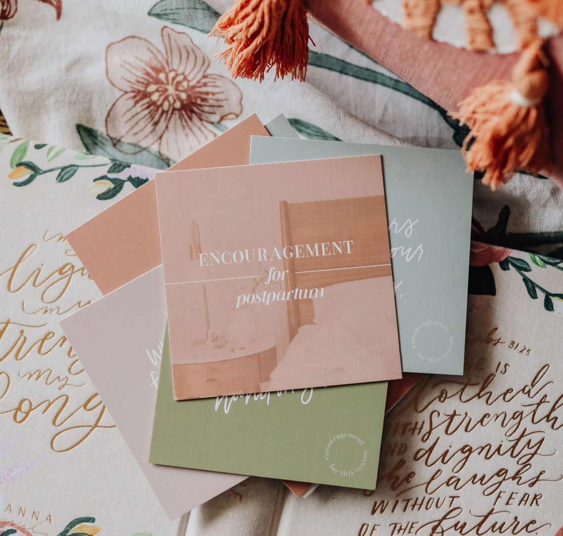 Encouragement For Postpartum Verse Card Set with wood stand. Designed to help postpartum moms cope with the unique challenges they face in the weeks and months after birth. This set includes ten, 4"x4" cards. One side of each card contains Scripture and the other side has an encouraging truth from God's Word to lift you up in times of loneliness, exhaustion, fear, and more.