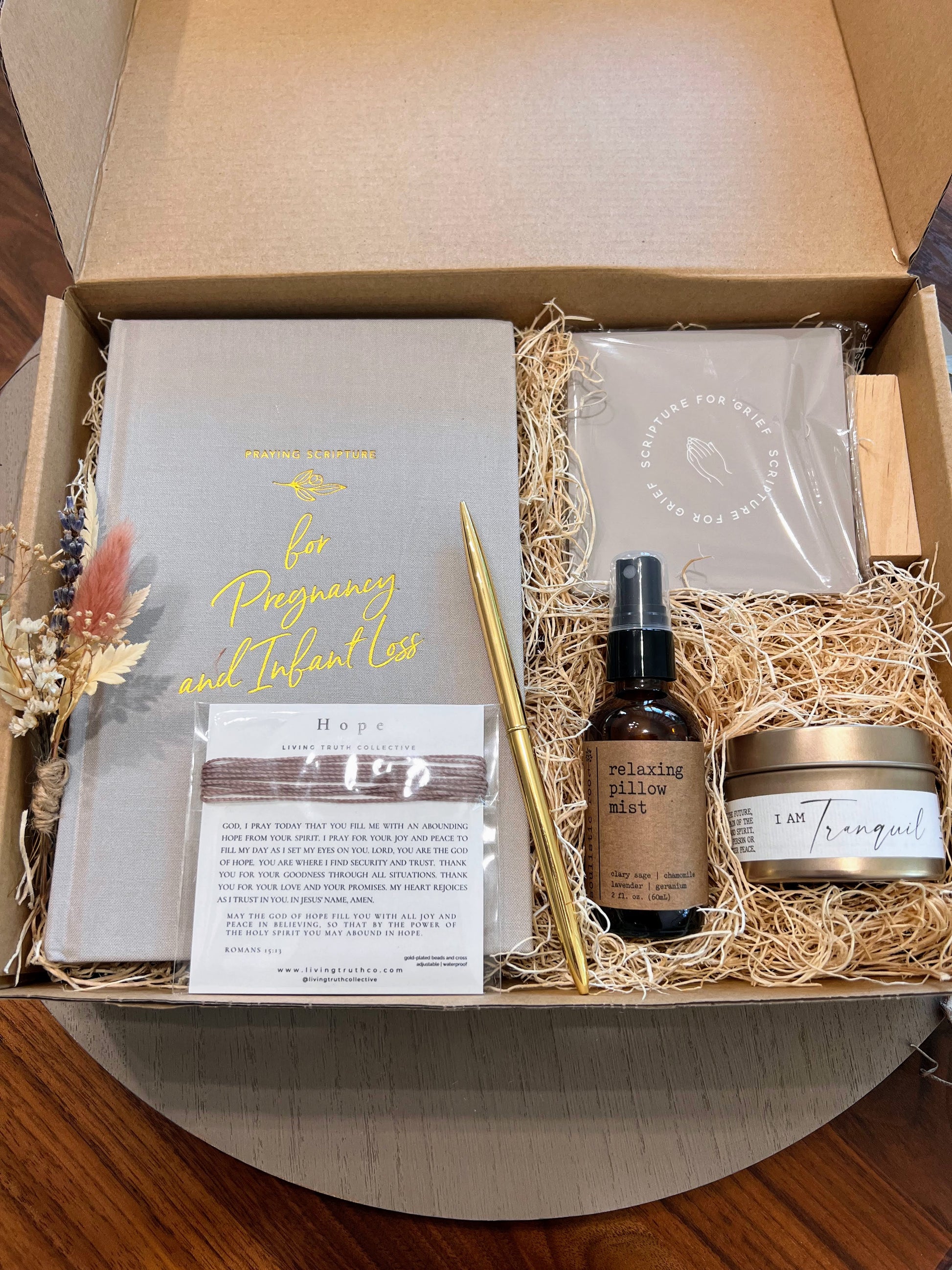 A thoughtfully curated gift box designed to support and uplift women grieving the loss of a baby. Each item offers comfort, hope, and peace, serving as a gentle reminder of God’s presence in the midst of sorrow. This box encourages moments of calm and reflection, inviting you to slow down, release worries through prayer and Scripture, journal your thoughts, and find renewed strength in His promises.