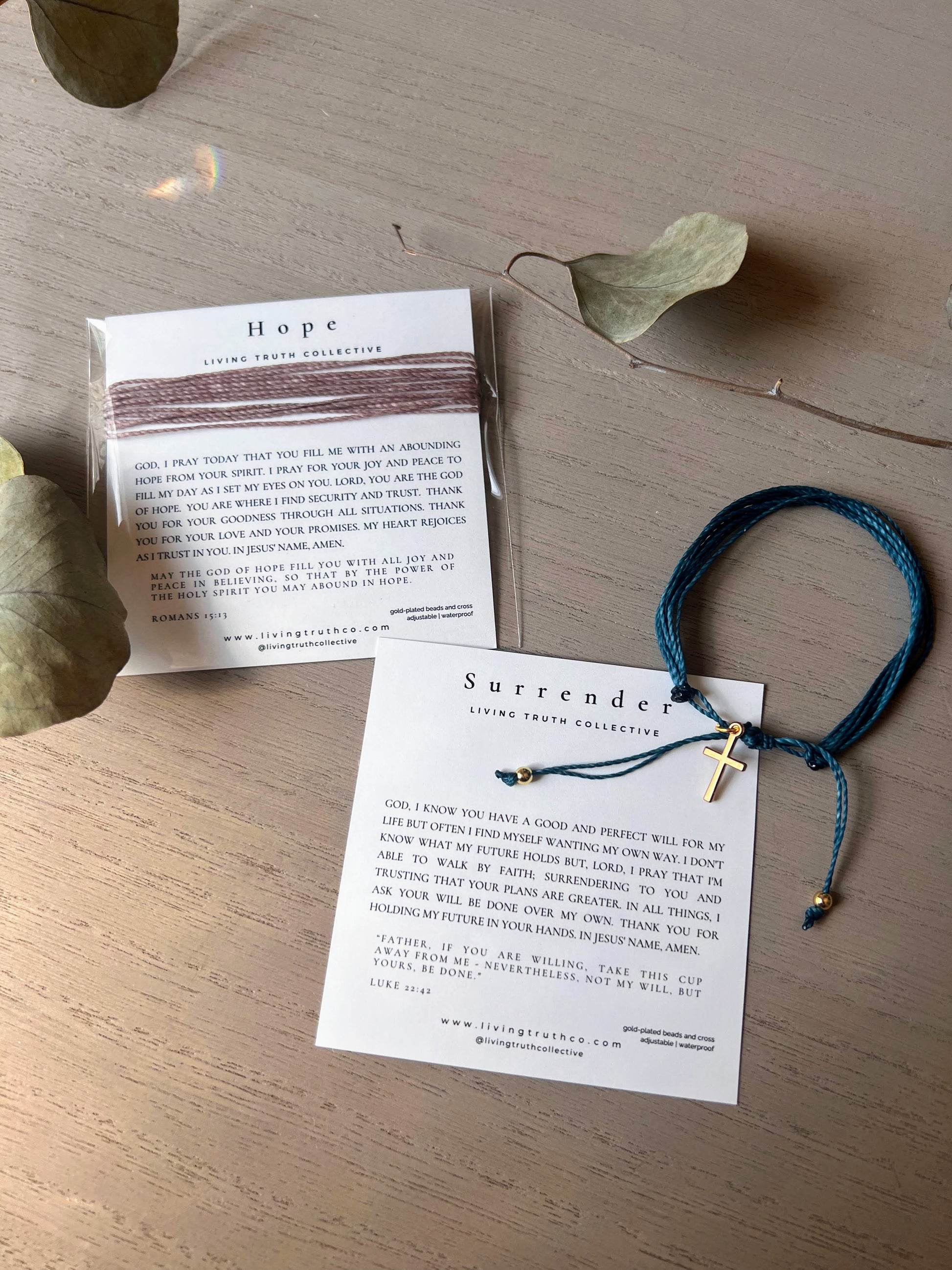 Handmade Bracelet. Adjustable and waterproof powerful prayer bracelets equip you with prayers to pray as you are reminded of the hope and strength you have in Christ. Made with gold-platted beads and cross, and it comes with prayer and verse memorization card. (Hope or Surrender prayer) By Living Truth Collective.